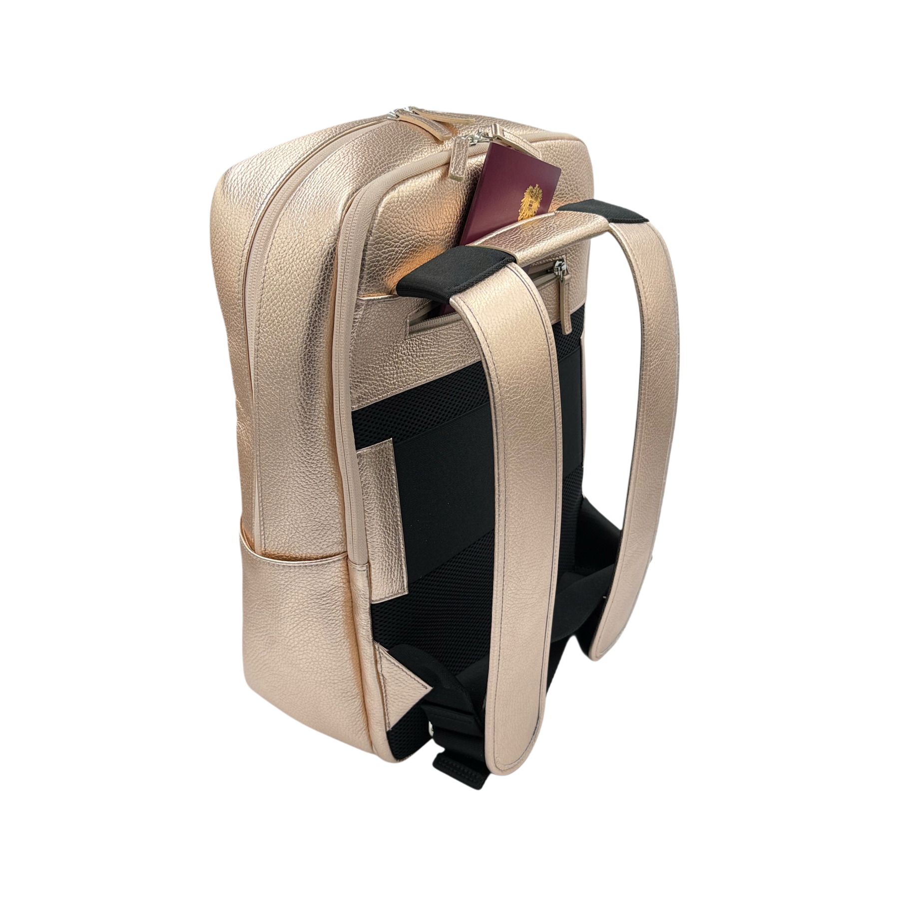 The exclusive PurePrivacy Business Backpack in stylish, eye-catching copper gold ishandmade from the finest Italian cowhide leather (Dollarino textured leather) with great attention to detail in our Italian partner factory. It combines thoughtful functionality, elegant design, and a valuable contribution to the protection of your privacy and your physical and mental well-being, making it the ideal companion for everyday use, the office, and business trips.