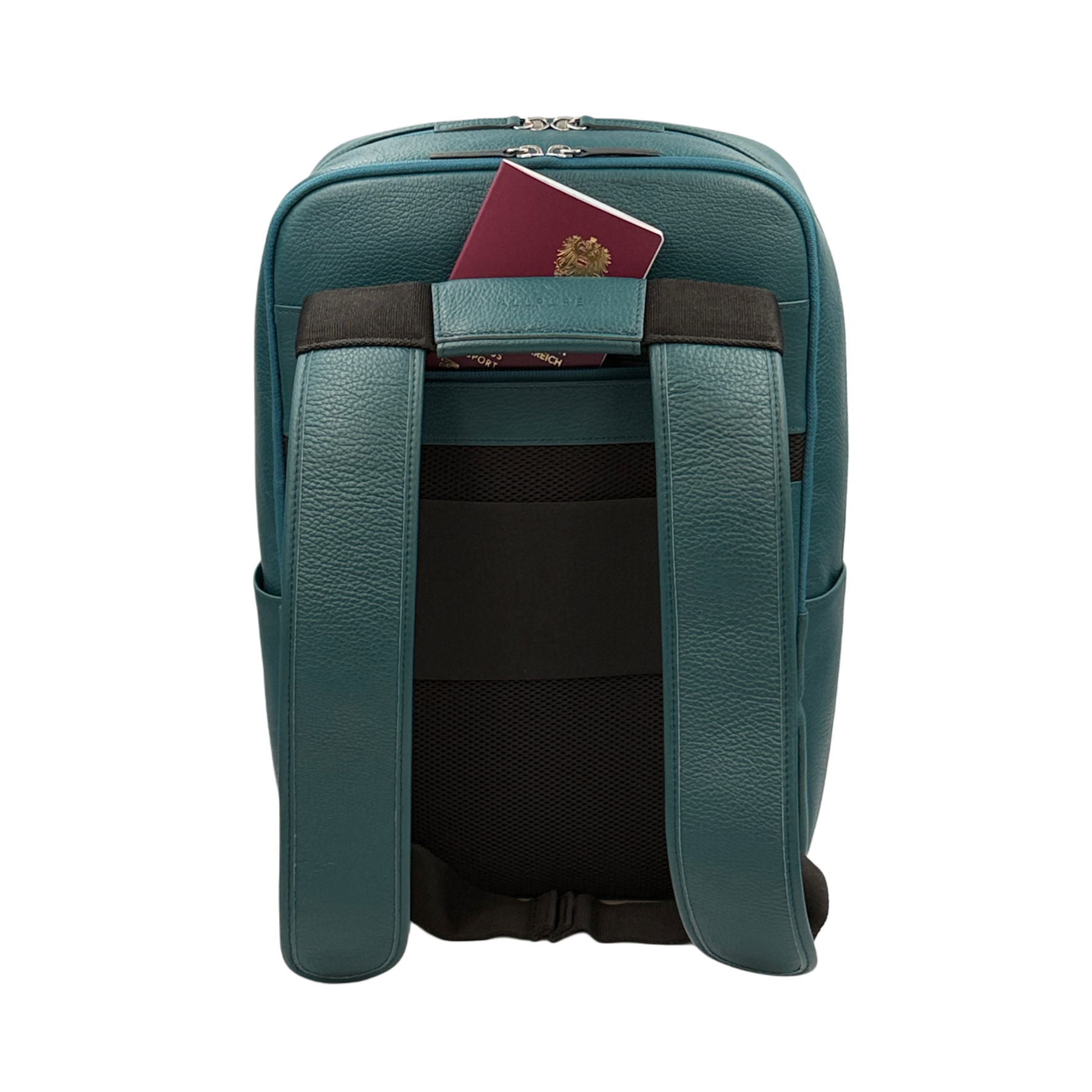 The exclusive PurePrivacy Business backpack, available in a stylish and eye-catching petrol blue, is handcrafted with meticulous attention to detail from the finest Italian cowhide leather (Dollarino textured leather) at our Italian partner manufacturer. It combines thoughtful functionality, elegant design, and a valuable contribution to the protection of your privacy as well as your physical and mental well-being, making it the ideal companion for everyday life, the office, and business trips.